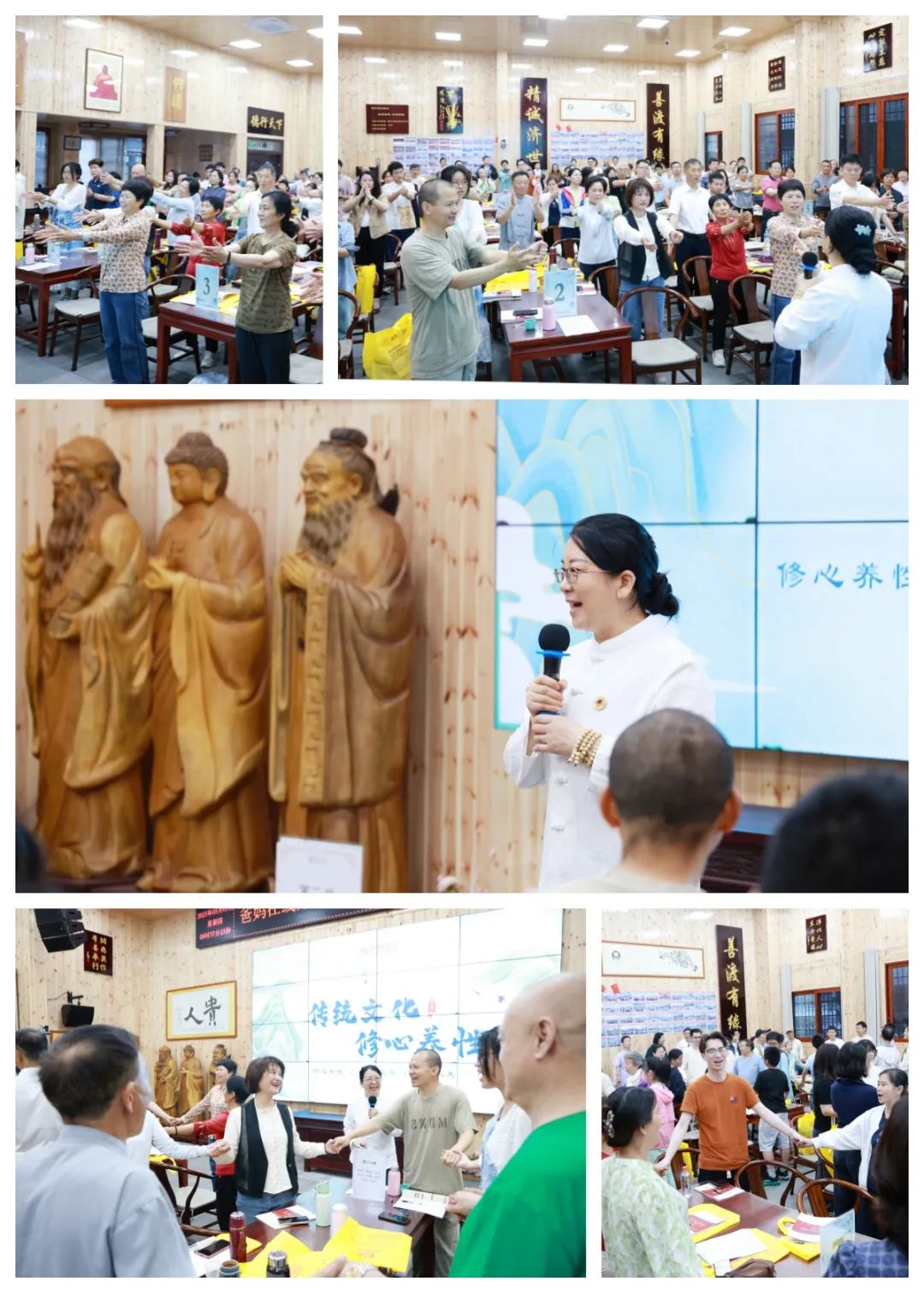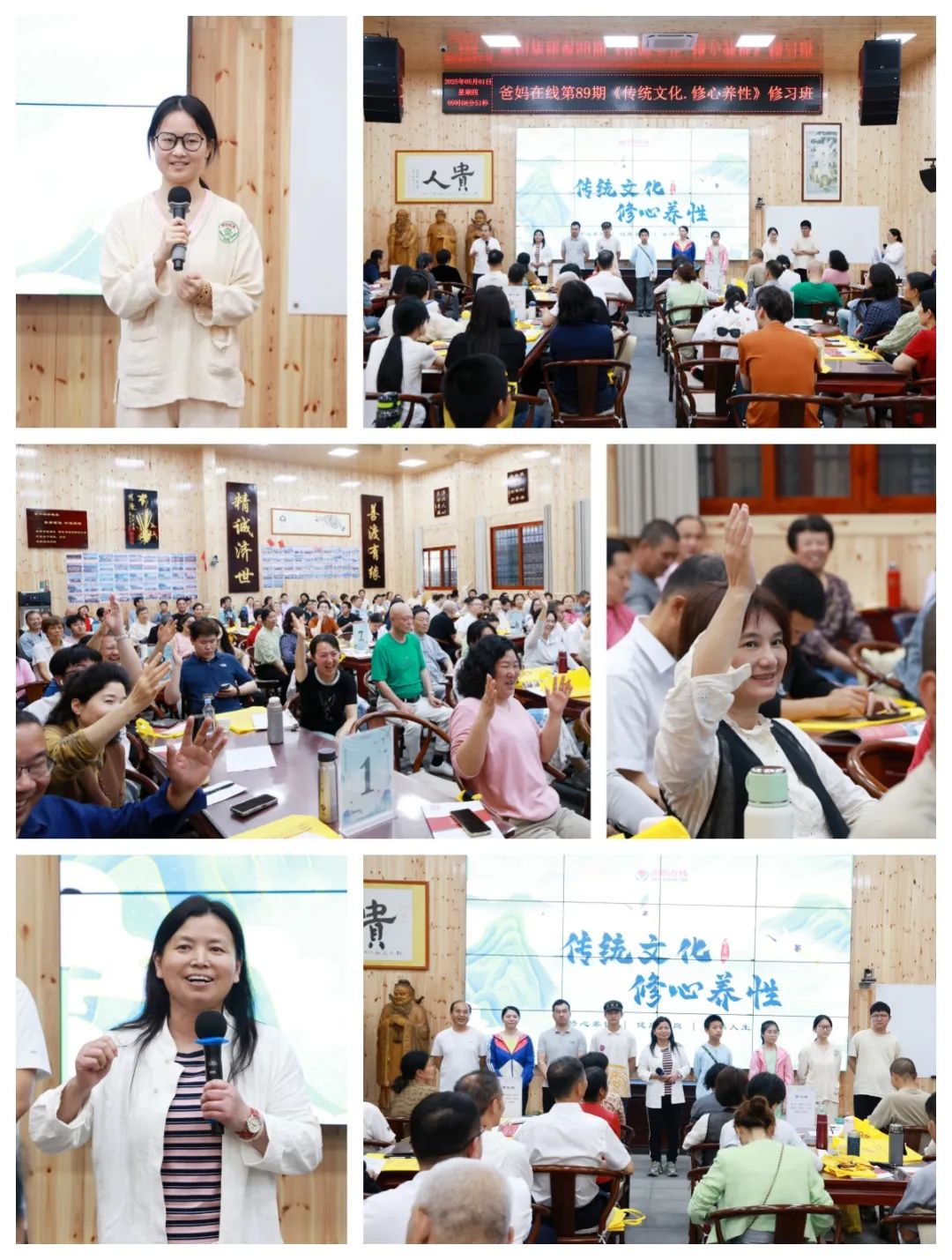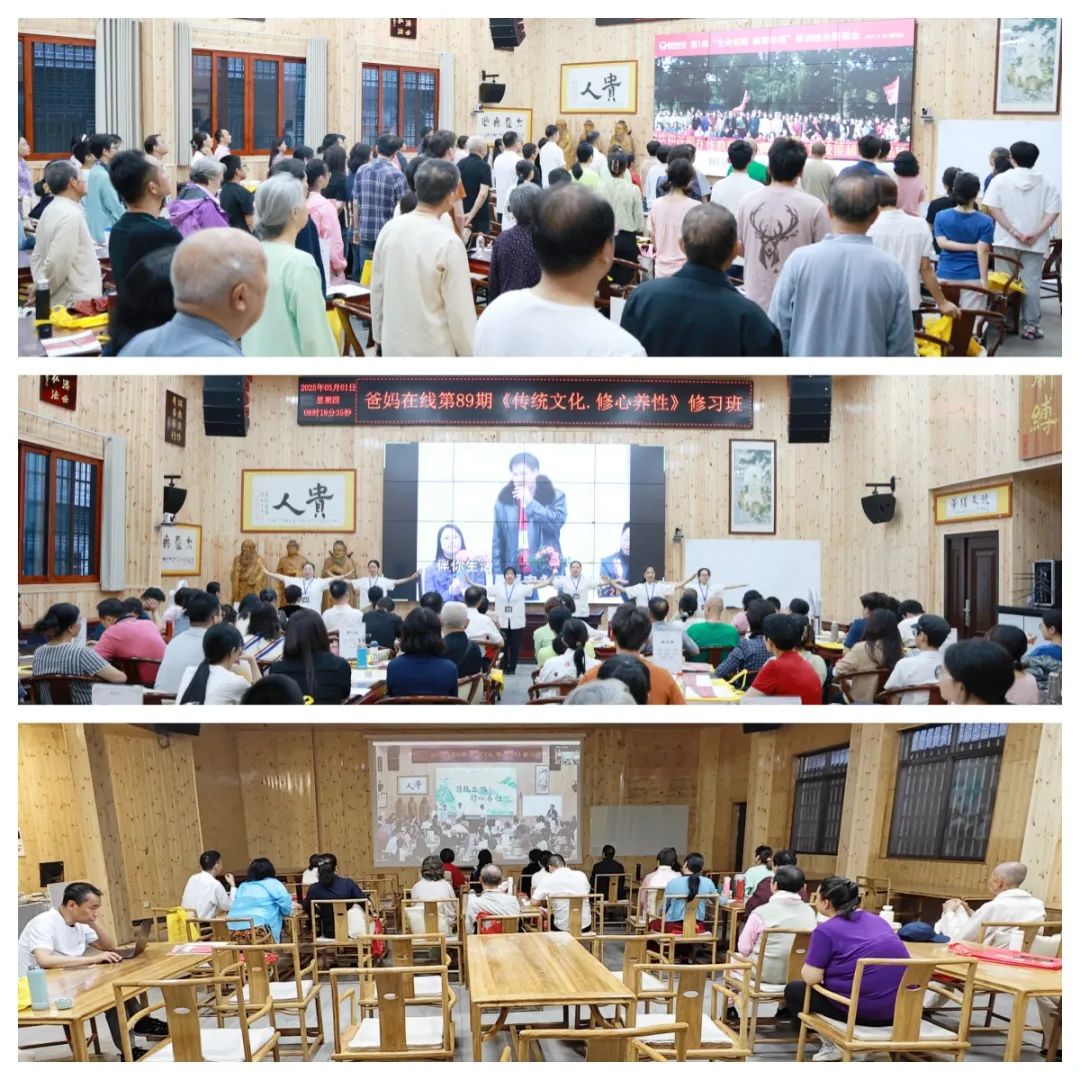 活动当日上午,禅心雅院沉浸在一片温暖祥和的氛围中。伴随着爸妈在线那充满希望与力量的歌曲《迎接世界美好的明天》、《我们是一家人》,以及康复中心带来的手语舞《爸妈在线祝福你》,本期修习班正式拉开帷幕。学员们学习传统文化的热情空前高涨,禅心雅院觉悟堂座无虚席,仍无法满足大家的求知渴望。为此,爸妈在线紧急开通第二教室——觉醒室,楼上楼下百余学员一同踏上了这场意义非凡的传统文化修习之旅。