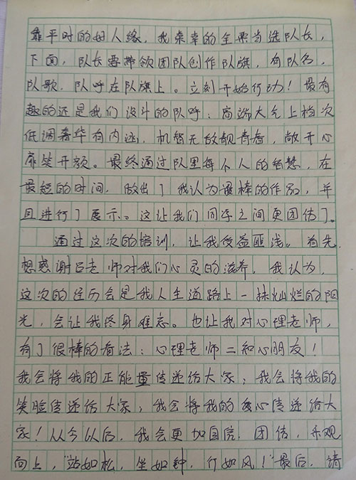 通过这次的培训,让我受益匪浅。首先,想感谢吕明臻老师对我们心灵的滋养。我认为,这次的经历会是我人生道路上一抹灿烂的阳光,会让我终身难忘。也让我对心理老师有了很棒的看法:心理老师=知心朋友!我会将我的正能量传递给大家;我会将我的笑脸传递给大家;我会将我的爱心传递给大家!从今以后,我会更加自信、团结、乐观向上,“站如松,坐如钟,行如风!”最后,请大家和我一起大声喊:我行!我能行!我是最棒的!