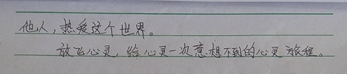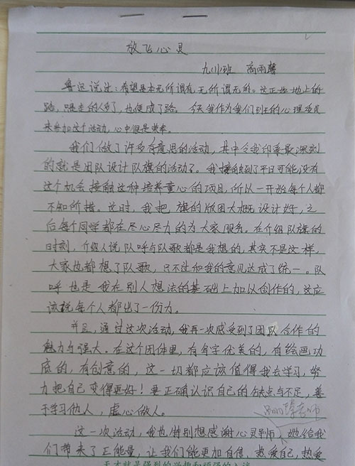并且,通过这次活动,我再一次感受到了团队合作的魅力与强大。在这个团队里,有写字优美的,有绘画功底的,有创意的,这一切都应该值得我去学习,努力把自己变得更好!要正确认识自己的缺点与不足,善于学习他人,虚心做人。这一次活动,我也特别想感谢心灵导师吕明臻老师,她给我们带来了正能量,让我们能更加自信,热爱自己,热爱他人,热爱这个世界。放飞心灵,给心灵一次意想不到的心灵旅程。