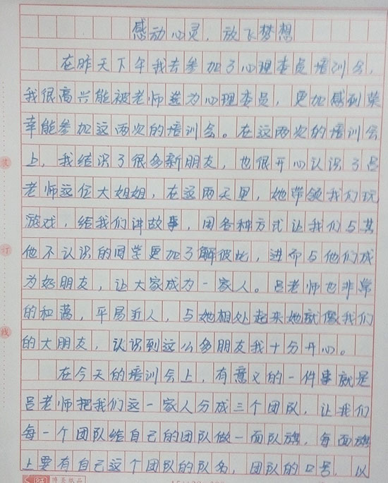 在昨天下午我去参加了心理委员培训会,我很高兴能被老师选为心理委员,更加感到荣幸能参加这两次的培训会。在这两次的培训会上,我结识了很多新朋友,也很开心认识了吕明臻老师这位大姐姐,在这两天里,她带领我们玩游戏,给我们讲故事,用各种方式让我们与其他不认识的同学更加了解彼此,进而与他们成为好朋友,让大家成为一家人。吕老师也非常的和蔼,平易近人,与她相处起来她就像我们的大朋友,认识到这么多朋友我十分开心。
