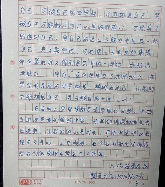 在这两天里很感谢吕明臻老师能在百忙之中抽出时间来我们荣程中学,给我们讲课和我们共同玩耍,让我们的心灵成长,希望吕老师以后能天天开心,工作顺利,在今后有机会还能回到我们的荣程中学这个大家庭。