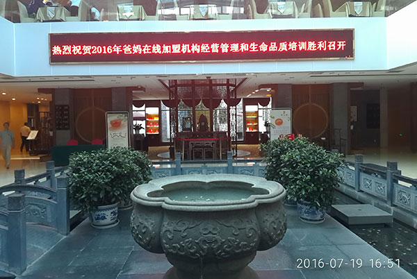 黄山醉温泉度假酒店的大堂上,早已打出“热烈祝贺2016年爸妈在线加盟机构经营管理和生命品质培训胜利召开!”灯光闪烁,向世人展示着:第七届心博会已万事齐备,我在这里等您来!